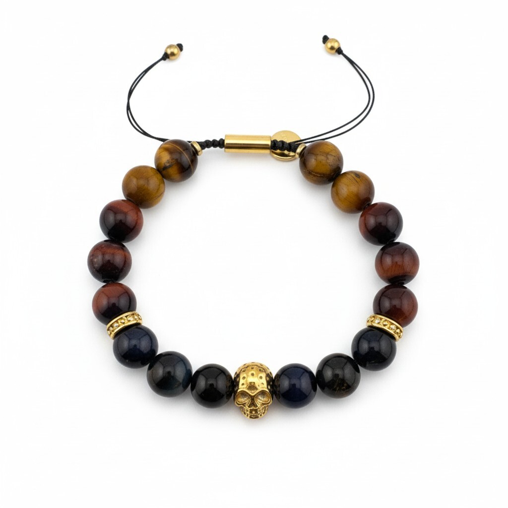 Браслет выполнен из натуральных камней: соколиный глаз, бычий глаз, тигровый глаз. Диаметр бусины 10 мм, ААААА, вставки из нержавейки с напылением 24k золота.