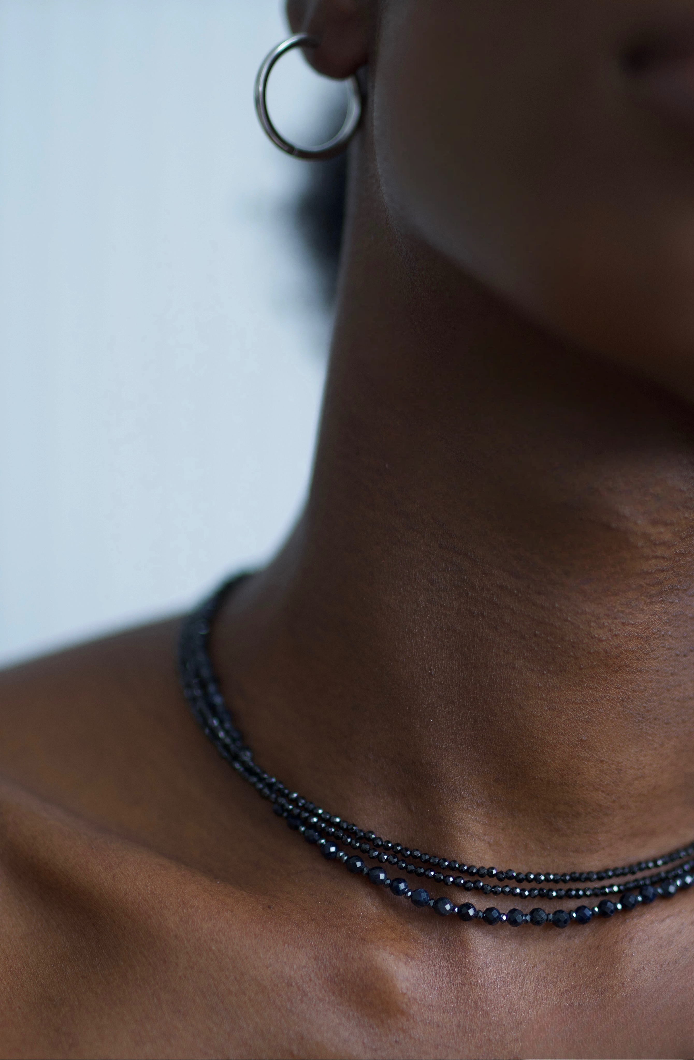 На модели: сапфировый чокер "Ореон" и чокер из черной шпинели "Темная ночь", серьги "Конго" в серебряном цвете.