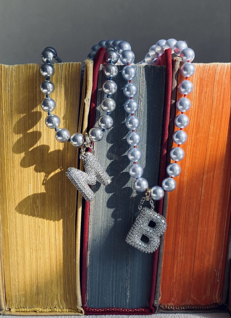 Белое колье собрано на серую нить, голубое колье собрано на красную нить, розовое колье собрано на розовую нить, серое колье собрано на красную нить.