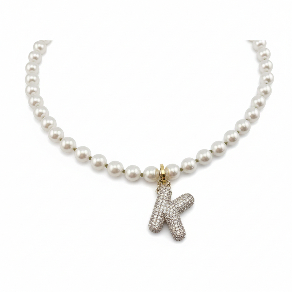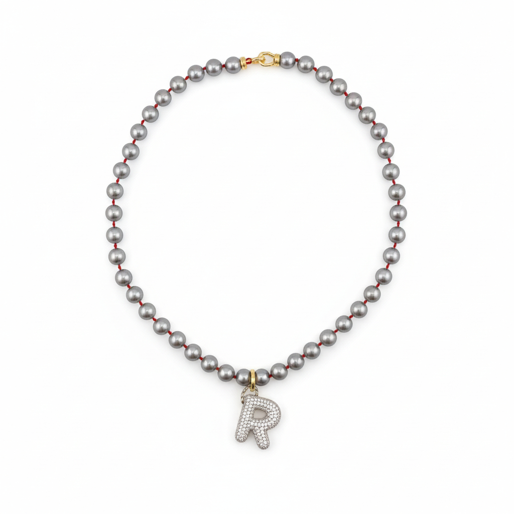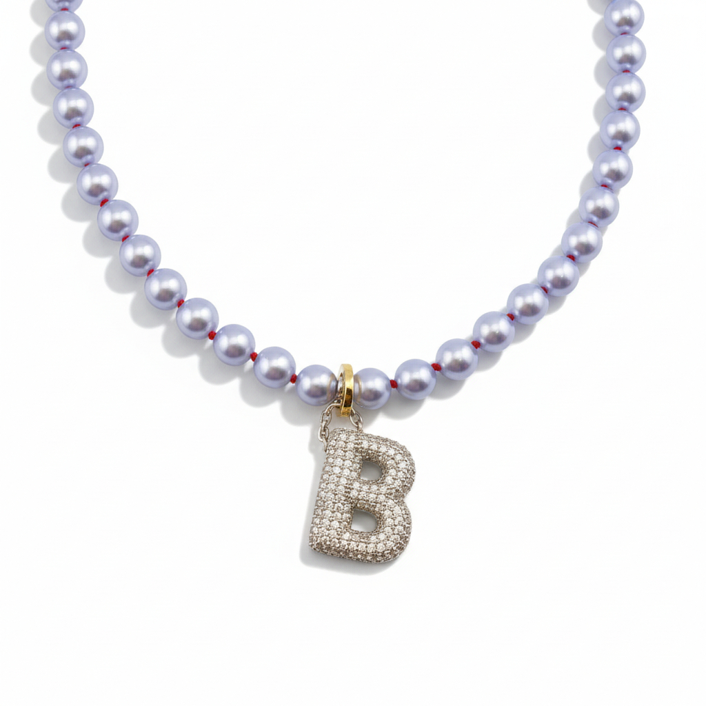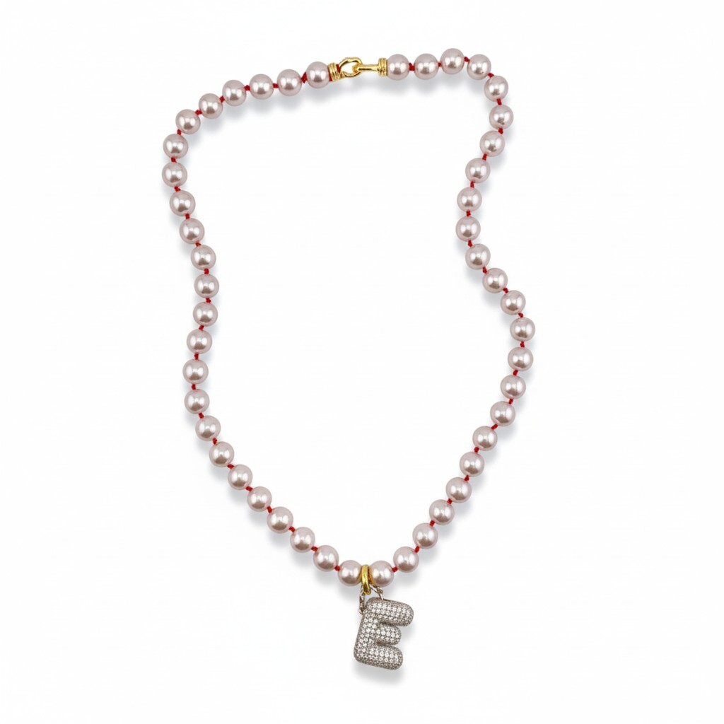 Майолика 8 мм, собранная на красный узел. Подвеска с буквой "М", усыпанной кристаллами.