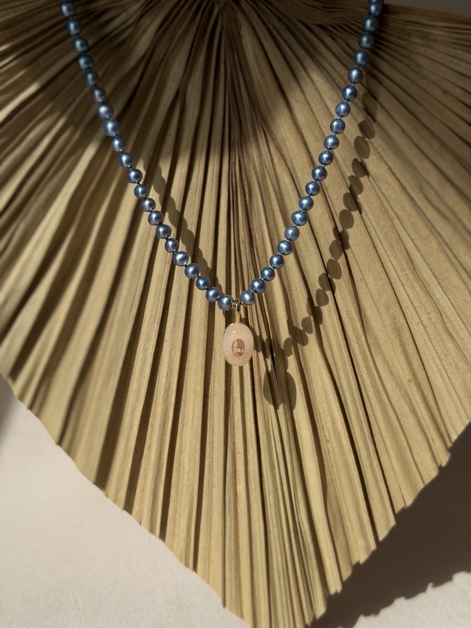 Колье из жемчуга 5 мм в голубом оттенке. Кулон по центру выполнен из латуни, основной камень - розовый нефрит с каплей циркона. Замок - юв. сплав.