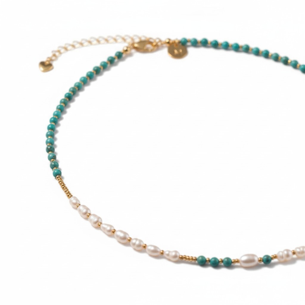 В составе: бирюза, жемчуг, японский бисер с позолочением, юв. сплав.