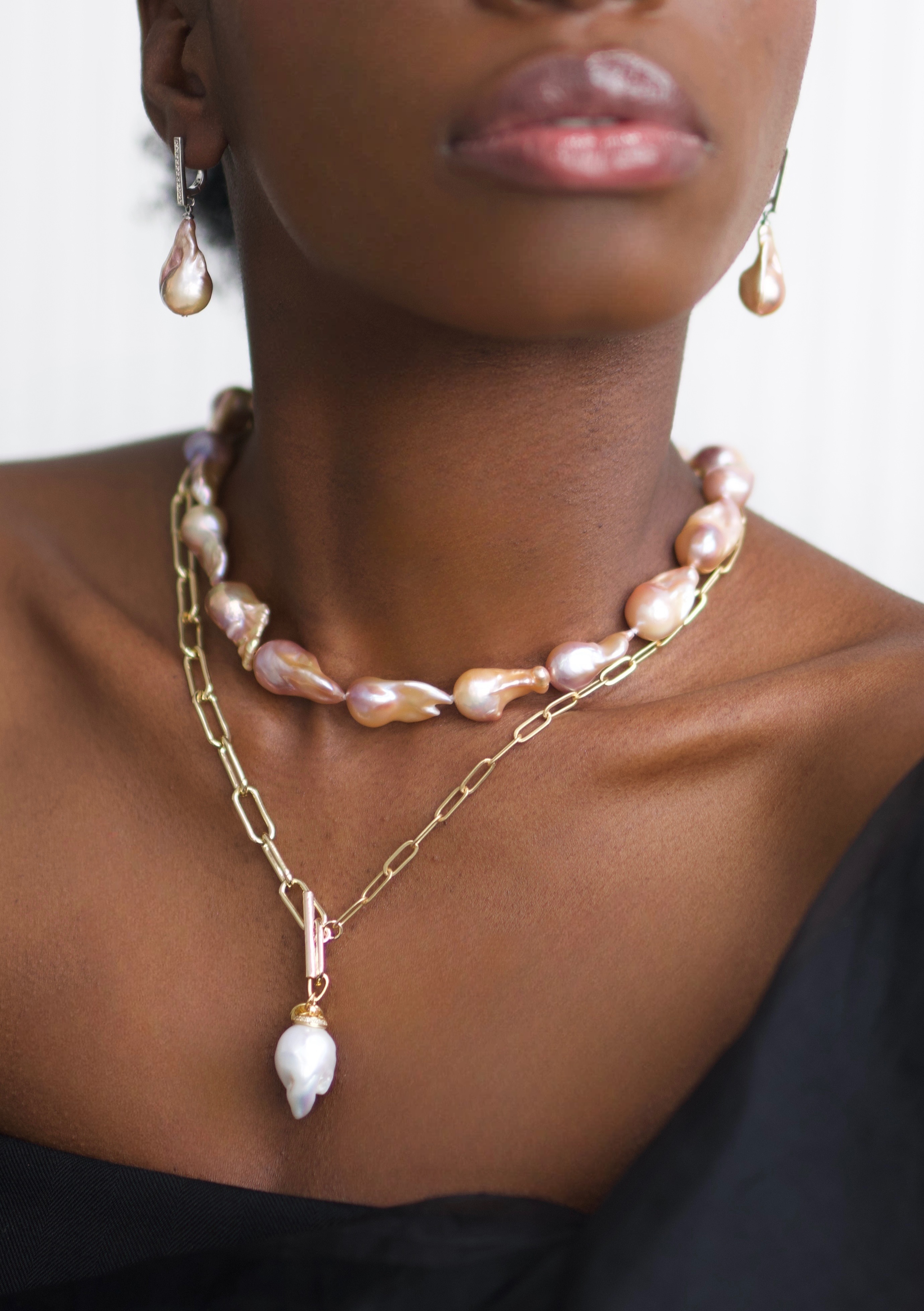 Цепочка с кулоном, натуральная жемчужина Барокко в розовом оттенке.